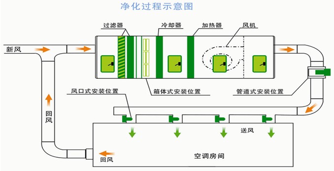 光波净化系统完整净化过程由二部分组成,首先在中央空调箱进/出风口安装处理大风量的大功率管道型净化装置,进行第一道空气净化消毒处理;然后在出风口位置装一个小型风口型净化装置,进行第二道净化消毒处理,经过二次净化消毒,洁净的空气安全进入室内。