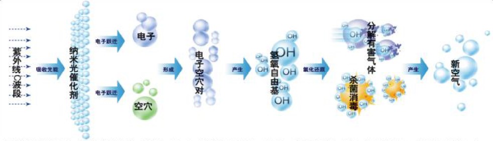 光子波的特定光波频率介于不可见光和紫外线波长之间,空气中的氧气和水蒸气受到特定的频谱的光波的照射后,产生光电化学反应,生成臭氧、过氧化氢、羟自由基及负离子。